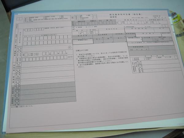 そしてその書類2部に必要事項を記入します。記入方法は、丁寧な解説が置いてあるのでそれを参考にして記入します。ほとんど車検証に記載されていることを書き写すだけなんで簡単です。注意する点としてはボールペンで書くところと鉛筆で書くところがあるので、間違わないようにしましょう。
