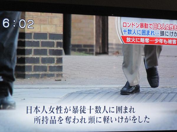 1.8日(月)深夜、ロンドン在住邦人女性(30代前半)がロンドン東部ウエスト・シルバータウン駅付近で、暴動に荷担していた10代後半の男女10数名に囲まれ、その際に揉み合いとなり、転倒して頭部に負傷をおうと共に所持品を盗まれたことが10日夕刻、被害者本人の連絡により判明しました。これを受け、当館今村朗総領事より英国外務省に対し、日本人の安全について適切な措置をとるよう、申し入れました。