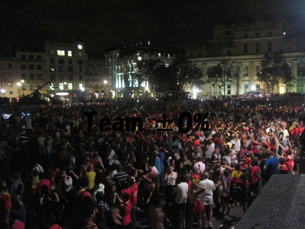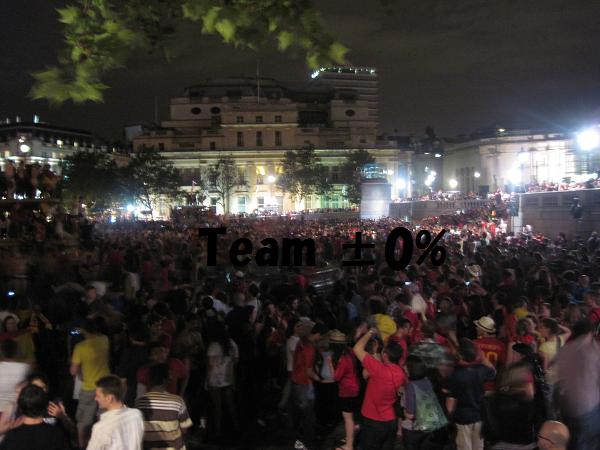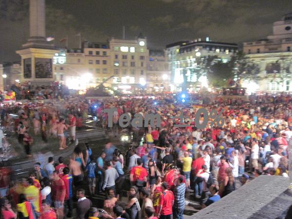 そんだけの盛り上がりを見せるだけあってロンドンでもその日の夜はピカデリーサーカス&トラファルガー広場では大騒ぎ。ロンドンのスペイン人が全員集合したのではないかというぐらいに大集結。エロスの像に登ったり、ライオンの上に登ったり、噴水の上に登ったり、水浴びしたり・・・。